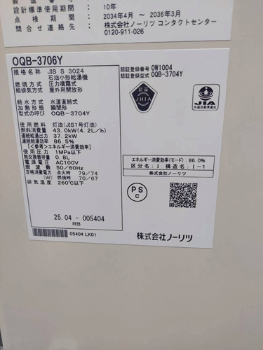 五泉市東本町 ノーリツ石油小形給湯機OQB-3706Y 給湯器交換工事
